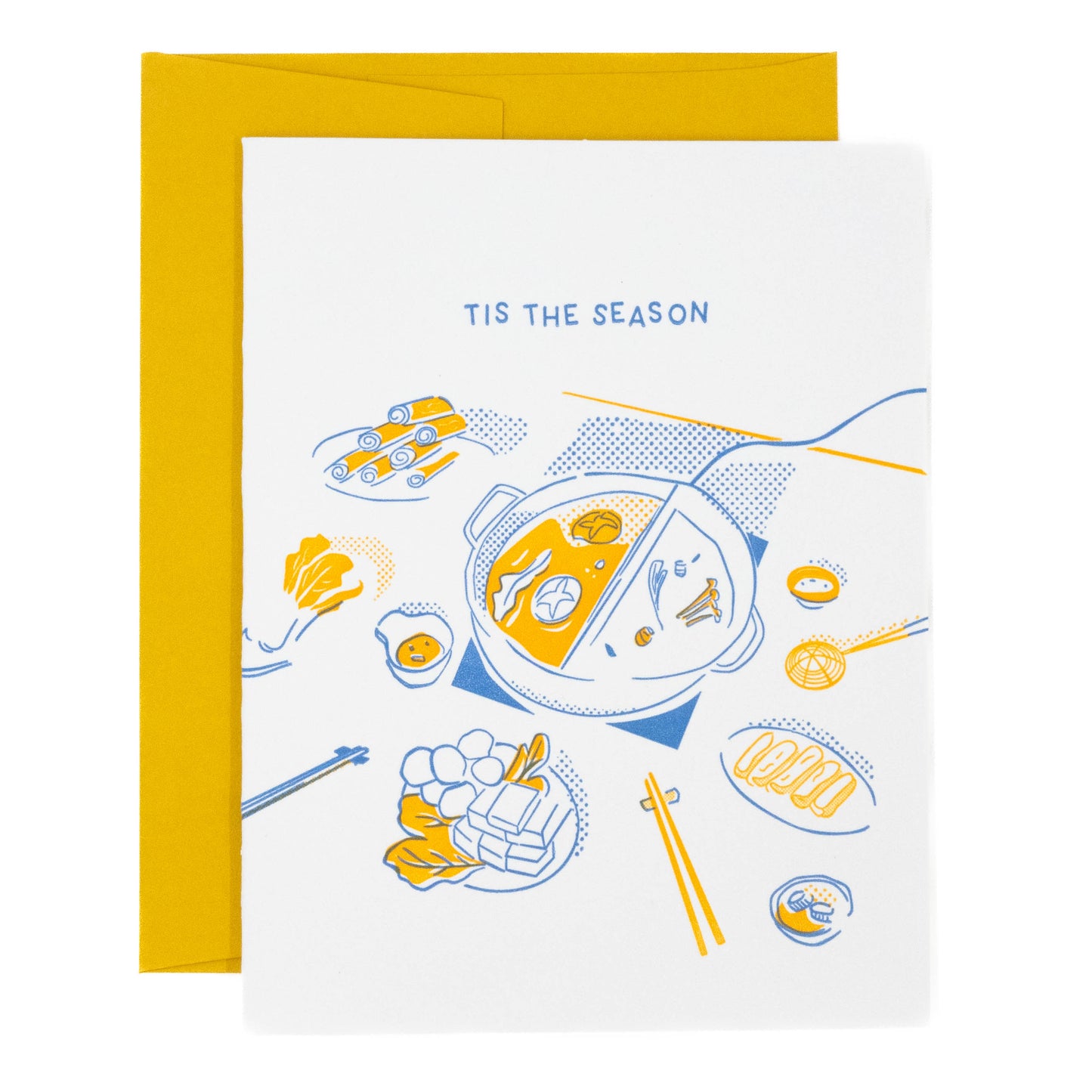 It's hot pot season! This fun card illustrates your table setting for hot pot, including the center divided pot, various meats, veggies, condiments and utensils to gather together for a warm meal.